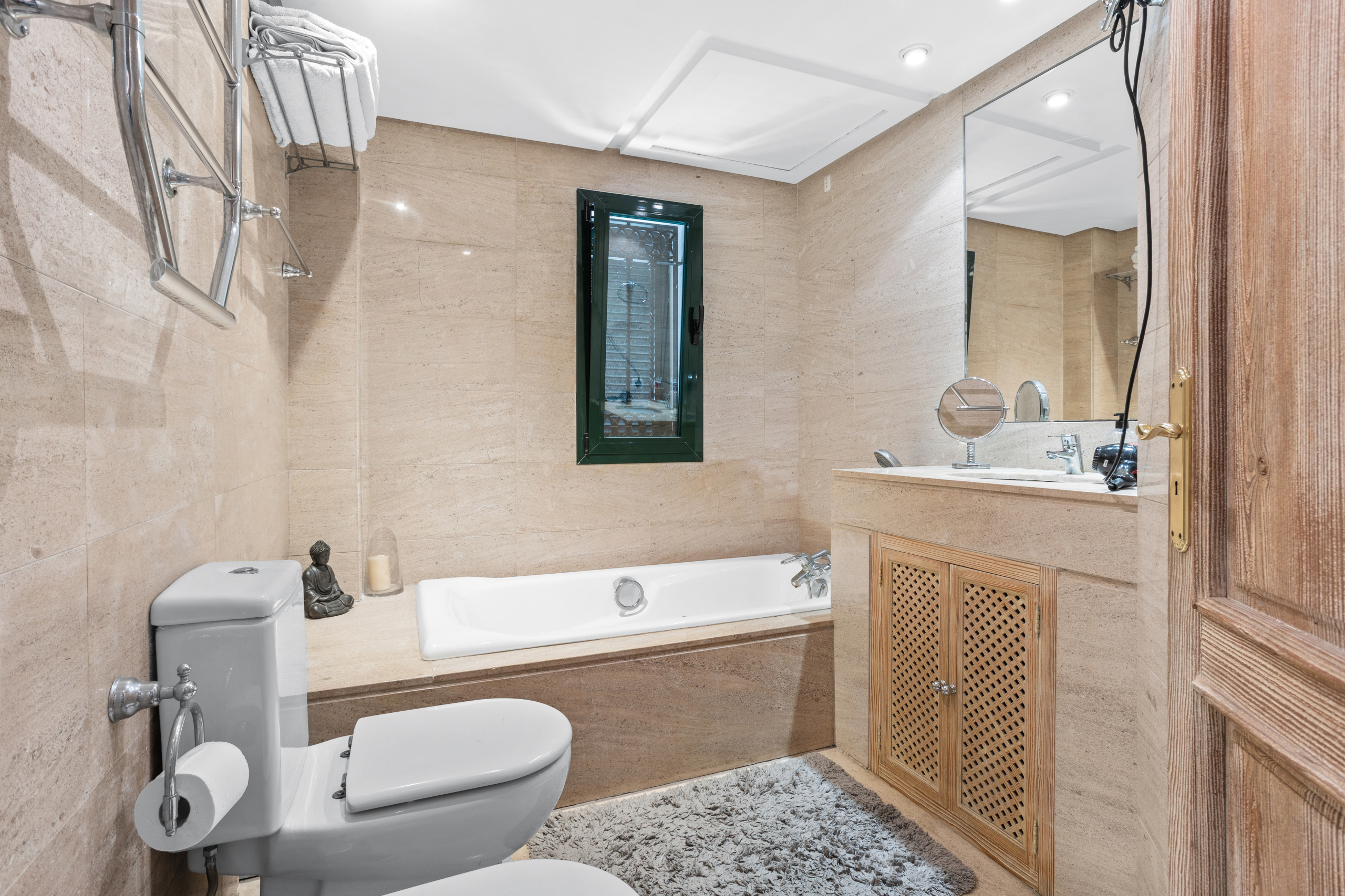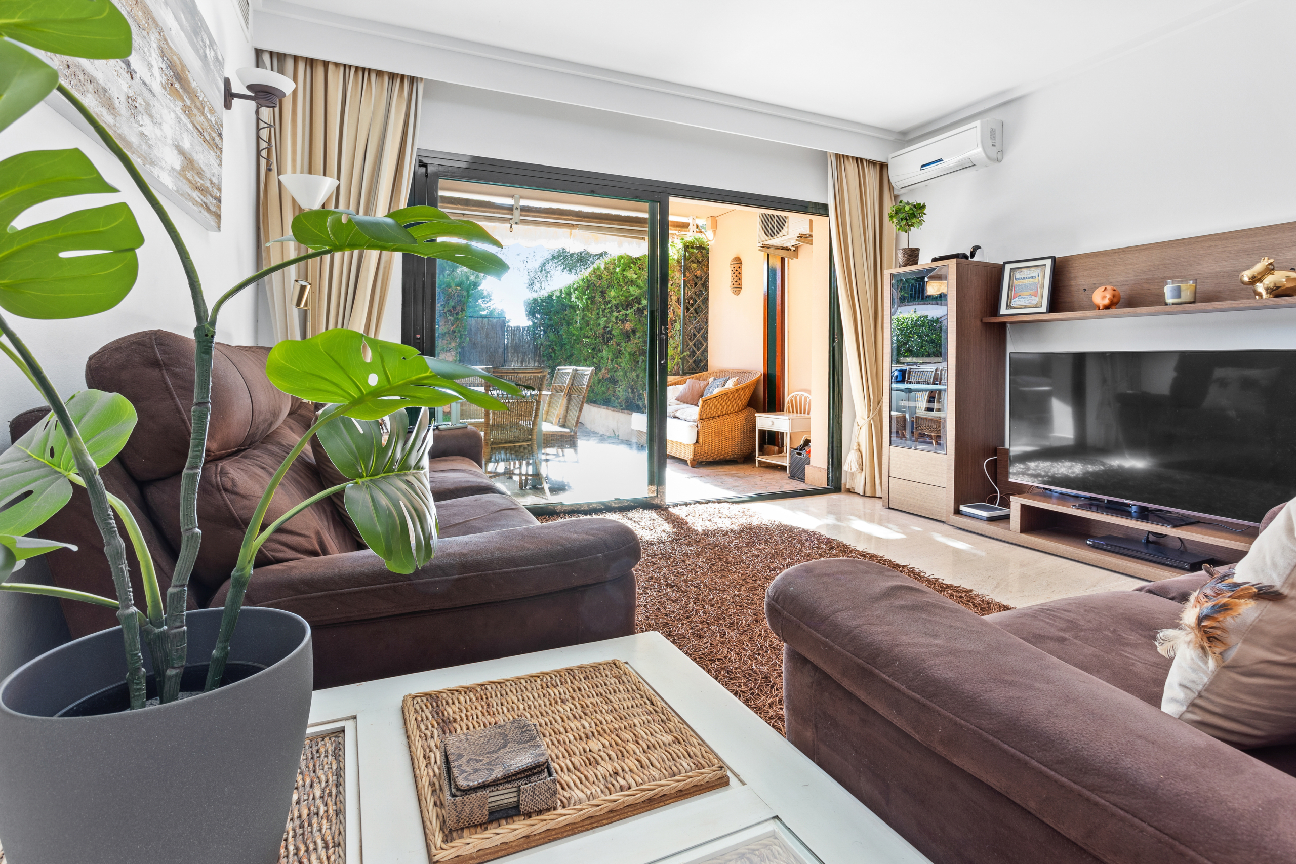 Die Wohnung bietet ein stilvolles Ambiente, in dem sich moderne Annehmlichkeiten und Eleganz vereinen. Die Wohnung umfasst eine einzige Ebene und setzt sich aus einer Diele, einem offenen Wohn- und Essbereich sowie einer komplett eingerichteten Küche zusammen, die über eine Frühstücksbar betretbar ist. Das Hauptschlafzimmer bietet einen direkten Zugang zur Außenterrasse. Insgesamt gibt es zwei Doppelschlafzimmer. Ein gut ausgestatteter, integrierter Hauswirtschaftsraum erleichtert den Alltag.