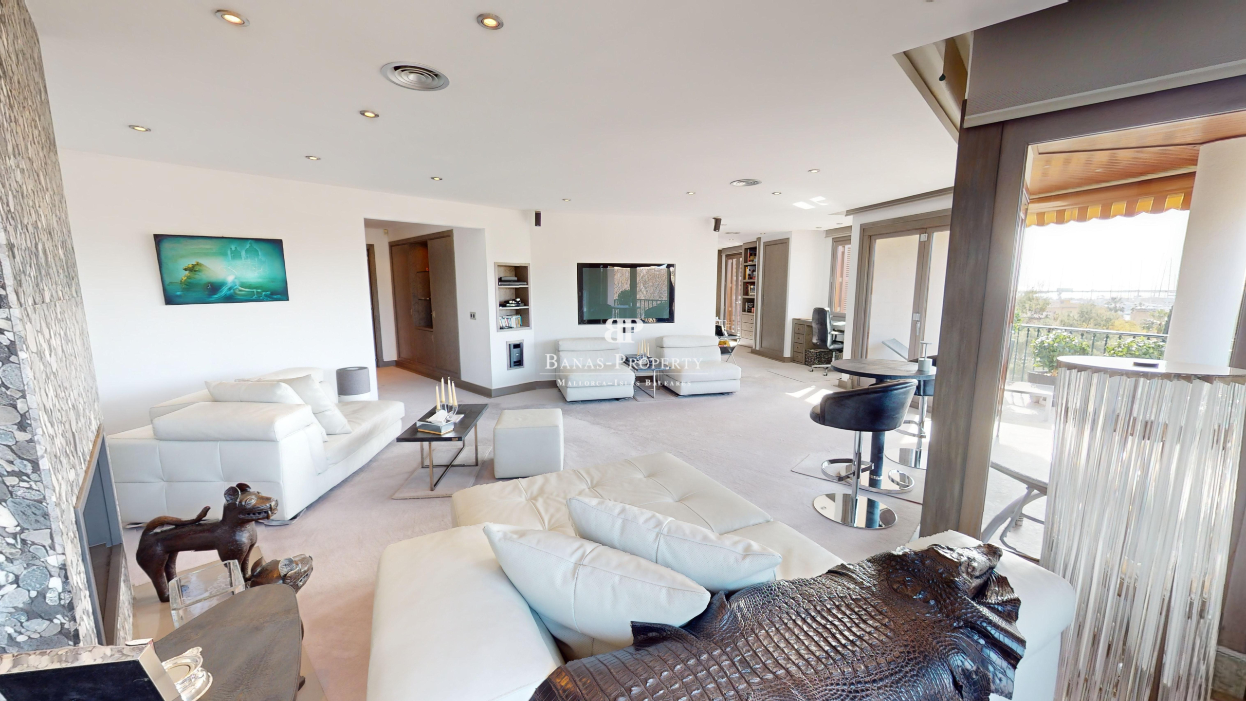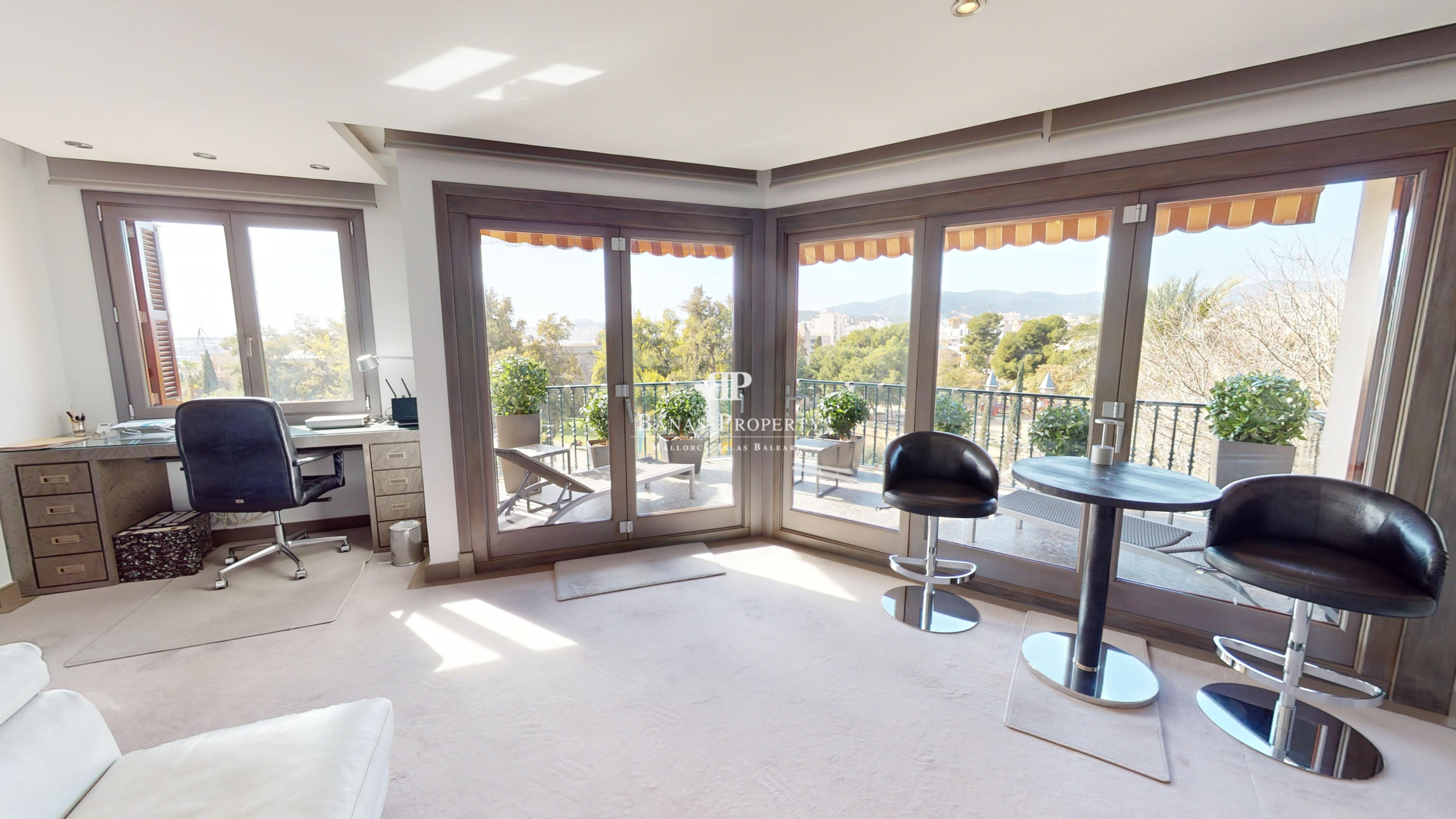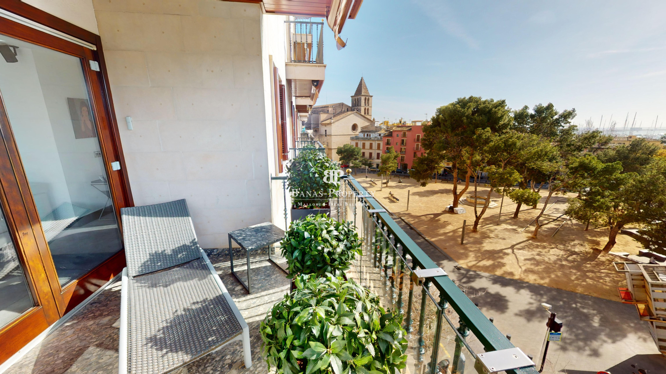Außergewöhnliche Wohnung im 4. Obergeschoss in einem herrlichen traditionellen Gebäude. Die Wohnung beeindruckt mit 230 qm und Ihrer Top Lage. I Mitten im besten alten Stadtzentrum von Palma – mit Hafen- und Meerblick gegenüber vom Parc Catalina und neben dem Museum für moderne Kunst. Das elegante Interieur wurde mit High-End-Maßanfertigungen 2017 aufwändig gestaltet. Alle Räume sind sehr großzügig. Das riesige Schlafzimmer ist mit großen Fenstern und Einbauschränken ausgestattet. Der Wohn-und Essbereich mit offener Einbauküche ist ebenfalls sehr großzügig und hell . Die Wohnung ist für Menschen die es lieben, direkt in der schönen Stadt Palma zu sein, und doch gleichzeitig sehr ruhig zu wohnen. Die außergewöhnliche Wohnung ist über einen Personenaufzug oder Treppe zu erreichen. Ein Tiefgaragenplatz im Gebäude gehört ebenfalls dazu. Vom Balkon aus hat man einen wunderschönen blick auf den Parc und den Hafen und das Meer. Des Weiteren gibt es ist ein Büro und drei Badezimmer, sowie Klima warm/kalt. In vertrieblicher Kooperation mit der Firma STRATECON aus München. Der Eigentümer ist auch bereit im Rahmen eines sogenannten Forward Deals noch einige Jahre in der Wohnung, die ja nur einige Wochen im Jahr genutzt wird, zu bleiben. Dies würde selbstverständlich den Kaufpreis kürzen. Nähere Details nach persönlicher Rücksprache.