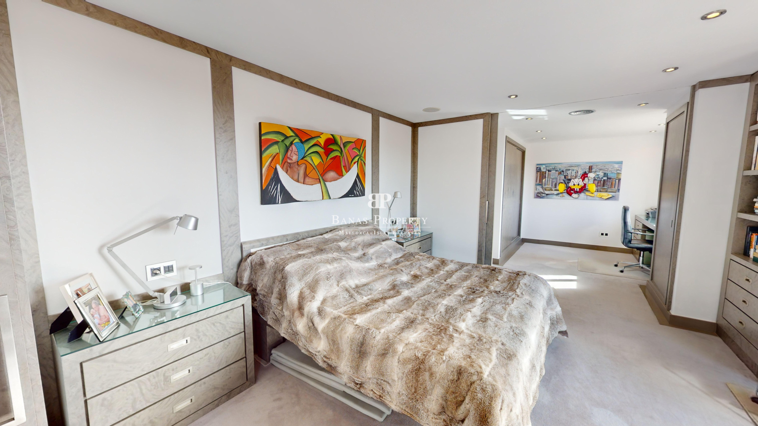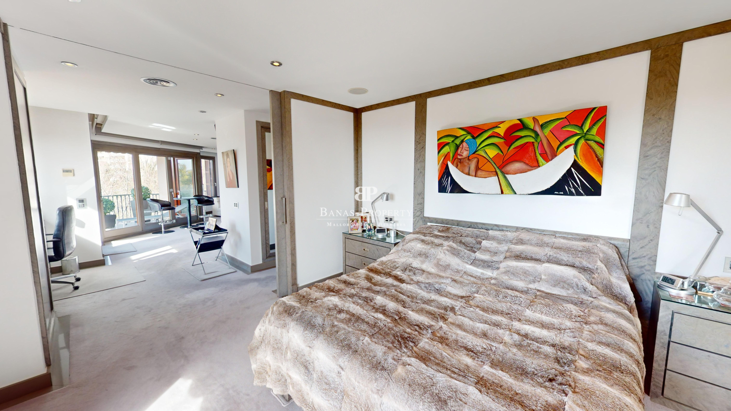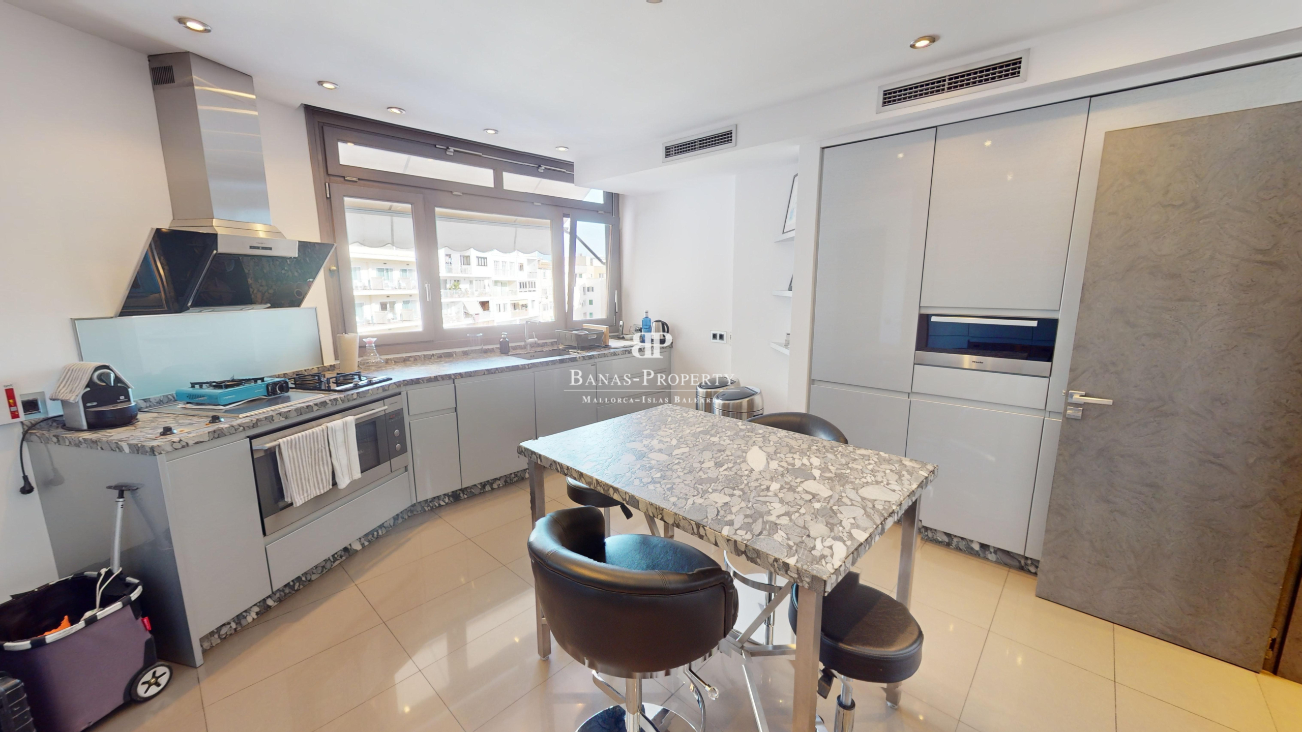 Außergewöhnliche Wohnung im 4. Obergeschoss in einem herrlichen traditionellen Gebäude. Die Wohnung beeindruckt mit 230 qm und Ihrer Top Lage. I Mitten im besten alten Stadtzentrum von Palma – mit Hafen- und Meerblick gegenüber vom Parc Catalina und neben dem Museum für moderne Kunst. Das elegante Interieur wurde mit High-End-Maßanfertigungen 2017 aufwändig gestaltet. Alle Räume sind sehr großzügig. Das riesige Schlafzimmer ist mit großen Fenstern und Einbauschränken ausgestattet. Der Wohn-und Essbereich mit offener Einbauküche ist ebenfalls sehr großzügig und hell . Die Wohnung ist für Menschen die es lieben, direkt in der schönen Stadt Palma zu sein, und doch gleichzeitig sehr ruhig zu wohnen. Die außergewöhnliche Wohnung ist über einen Personenaufzug oder Treppe zu erreichen. Ein Tiefgaragenplatz im Gebäude gehört ebenfalls dazu. Vom Balkon aus hat man einen wunderschönen blick auf den Parc und den Hafen und das Meer. Des Weiteren gibt es ist ein Büro und drei Badezimmer, sowie Klima warm/kalt. In vertrieblicher Kooperation mit der Firma STRATECON aus München. Der Eigentümer ist auch bereit im Rahmen eines sogenannten Forward Deals noch einige Jahre in der Wohnung, die ja nur einige Wochen im Jahr genutzt wird, zu bleiben. Dies würde selbstverständlich den Kaufpreis kürzen. Nähere Details nach persönlicher Rücksprache.