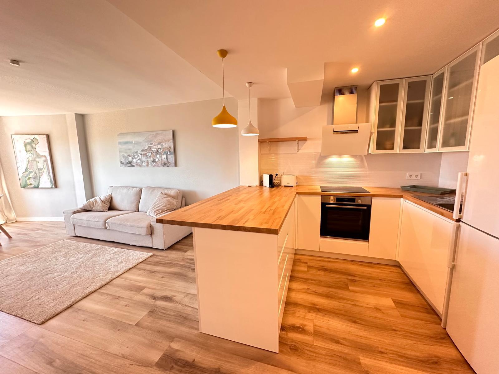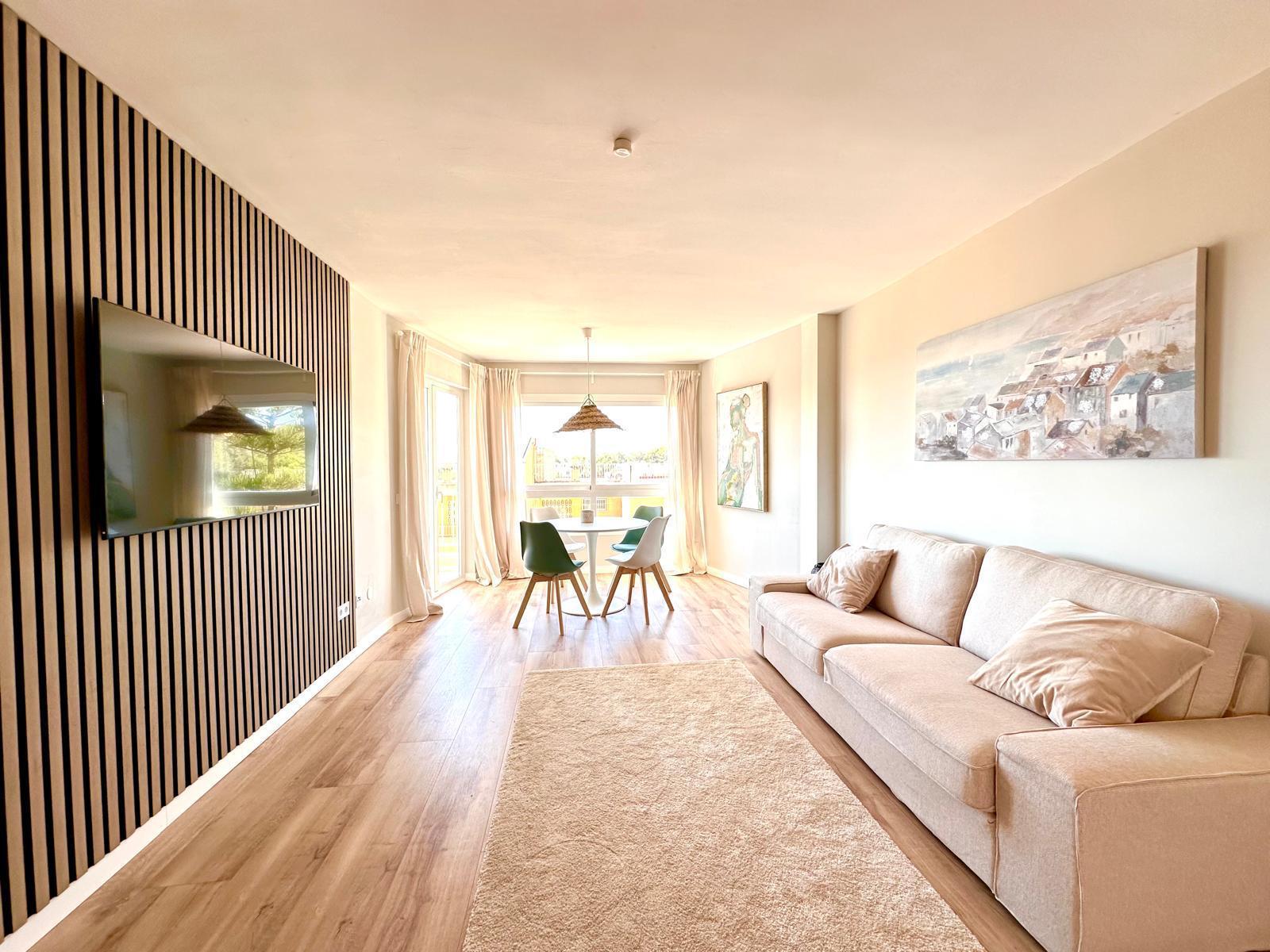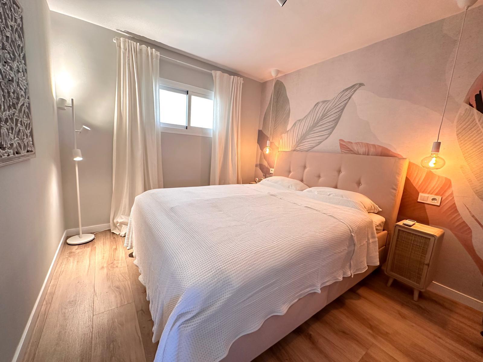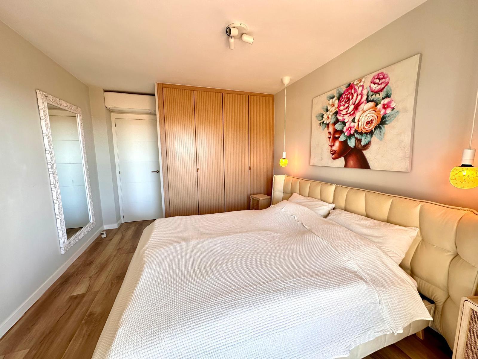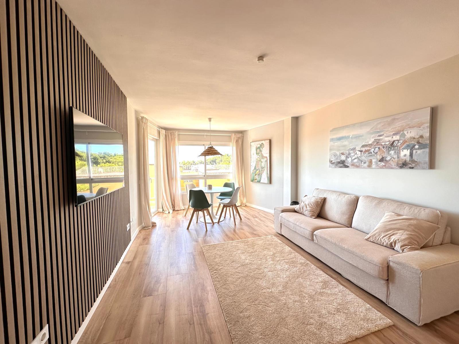 Diese neu renovierte Immobilie bietet einen hohen Standard und befindet sich in erstklassiger Lage mit Blick auf das Meer und die Berge. Mit einer optimalen Größe von 83 m² verfügt sie über eine hochwertige und moderne Ausstattung, die auf Wunsch auch komplett möbliert sein kann. Die offene und helle Raumaufteilung ermöglicht einen direkten Zugang zu einem großzügigen Balkon. Die offene Wohnküche ist mit modernen Geräten und einer großzügigen Arbeitsfläche ausgestattet. Es gibt zwei Schlafzimmer, die beide Zugang zum Balkon haben, sowie zwei moderne Badezimmer, die mit passiver Deckenbeleuchtung und Mosaiken gestaltet sind. Zusätzlich gibt es eine Waschküche mit Anschluss für eine Waschmaschine. Besondere Merkmale sind eine dekorative Akustikwand mit einem Smart-TV im Wohnzimmer, ein großer Einbauschrank im Hauptschlafzimmer und eine Alarmanlage mit Videostreaming auf das iPhone. Alle Zimmer sind mit einer Klimaanlage (warm/kalt) ausgestattet. Das nagelneue Inventar, einschließlich einer maßgefertigten Küche, ist im Kaufpreis enthalten. Der Energieausweis sowie alle erforderlichen Unterlagen sind vorhanden und werden bei der Besichtigung vorgelegt. Im Innenhof der ruhigen Anlage gibt es einen Gemeinschaftspool mit Dusche und Sonnenliegen. Die Bewohner sind freundlich und ruhig. Ein exklusiver, schattiger Parkplatz kann für 25.000 € erworben werden. Gemeinschaftskosten pro Monat: 100 € inkl. Wasser Strom / Monat: 45 € ca., nach Verbrauch