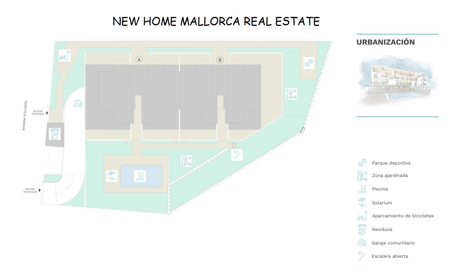 Klimaanlage warm/kalt, voll ausgestattete Küche, klimagerechte Isolierung, Schalldämmung, Luftwärmepumpe für Warmwasser, Einbauschränke, doppelt verglaste Fenster, Fliesenfußboden, Tiefgaragenstellplatz (Vorinstallation für Ladestation für Elektrofahrzeuge), Abstellraum, Hauswirtschaftsraum, Swimming-Pool, Gemeinschaftsgarten, Gemeinschaftsterrasse.